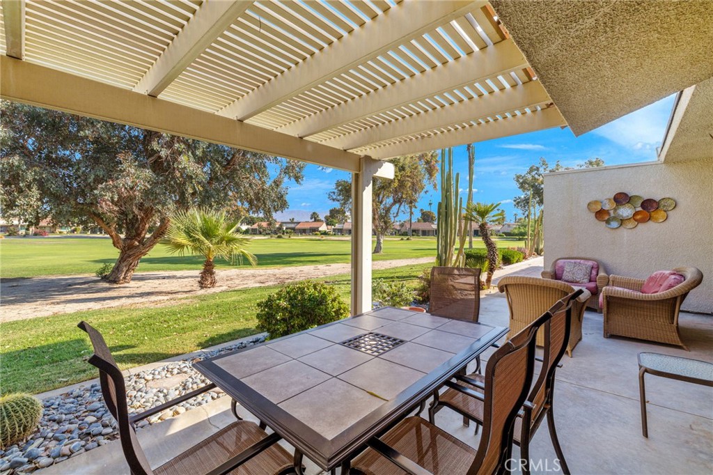 Views, Views Views! Welcome to 40310 Bay Hill Way, a gem within the prestigious Palm Desert Resort Country Club, home of 'Tennis in a Pickle, the largest pickleball club in the Coachella Valley. This charming 2-bedroom, 2-bathroom Vintage model features a thoughtful split master floor plan and an open-concept living area accentuated by vaulted ceilings. The updated kitchen and baths add a modern touch. Step outside to the extended patio, beautifully furnished, with piped in gas, where a beautiful pergola offers an ideal setting for al fresco dining or enjoying your morning coffee while taking in serene views of the golf course and lake. This turnkey furnished property is perfectly situated on Bay Hill, close to two pools and the clubhouse. As a resident, you'll have access to an array of amenities, including the largest pickleball club feathuring 28 pickleball & 7 tennis courts, Champion golf course, bocce ball, clubhouse dining and bar, cafe, pro shop, and 20 gated pools and spas. Short-term rentals are permitted, adding flexibility for potential income. Convenience is key, with proximity to Acrisure Arena, El Paseo shopping, dining options, the freeway, and the venues for Stagecoach and Coachella. Enjoy the perfect blend of luxury, leisure, and location at this exceptional property.