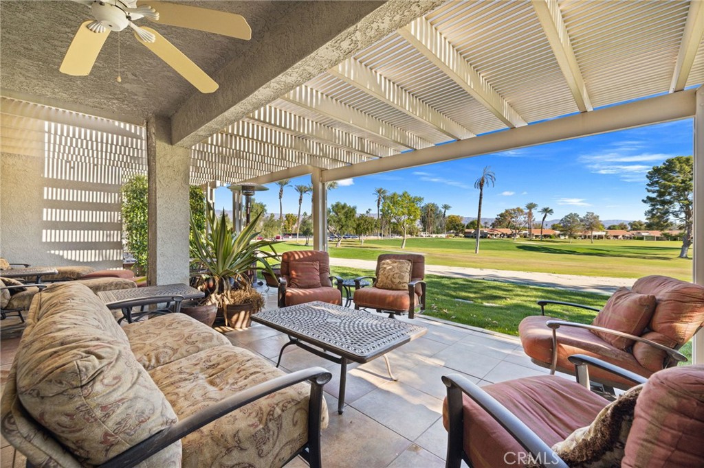 Welcome to the beautiful Resorter, also known as PDR, behind the gates of the Palm Desert Resort Country Club. This very coveted Classic floor plan is surrounded by mountains and a spectacular view of the golf course, just a short distance from the HUB of the fun: pickleball courts/tennis, clubhouse, bocce ball and golf starter. Located on the 5th tee, you will enjoy watching the golfers while soaking in the warm desert sun. The Classic has it all and is the most unique floor plan in PDR offering: vaulted ceilings in every room, split masters, open kitchen with ample storage, dining area with views of the golf course, fireplace, large extended patio, indoor laundry, two car garage with a private 2 car driveway and more. This spectacular unit has been completely remodeled to include: tile flooring throughout, completely remodeled bathrooms, reimagined remodeled open kitchen with all new appliances, gas range, utility kitchen sink, tankless water heater, opened up living room to create more space, designer furniture, extended patio with pergola and designer patio furniture, metal automated shades to close up and secure the home when it's not being used...... there is more, you just need to come and see it to believe it. PDR has a rich social life: 28 pickleball courts, 6 tennis courts, 20 pools & spas, clubhouse, cafe, pro-shop.... PDR allows short term rentals and is located close to El Paseo, shopping dining & Acrisure Arena.